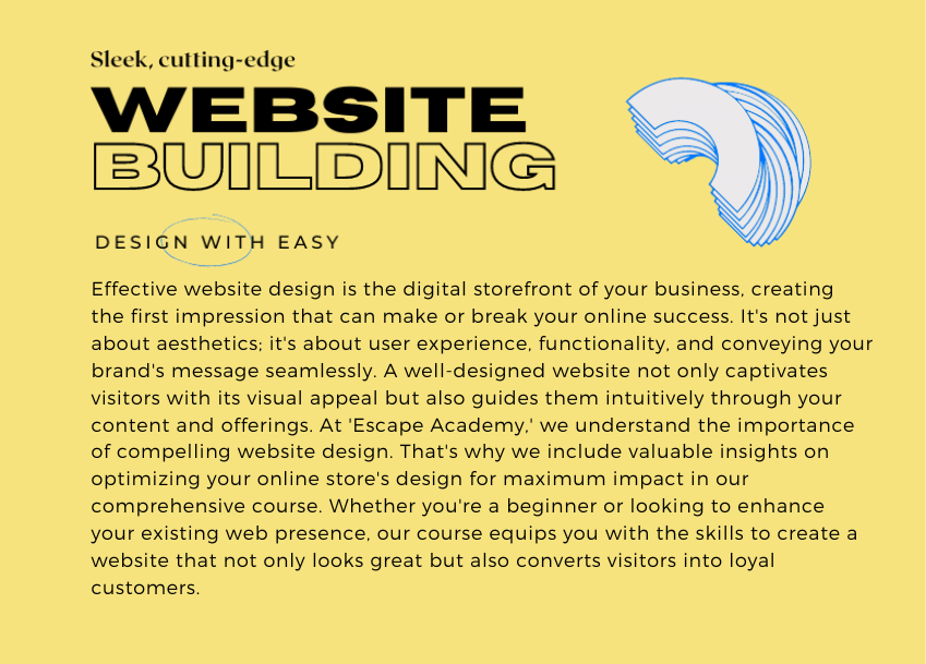 Your website's design is its digital storefront, setting the stage for online success. Beyond aesthetics, it's about user experience, functionality, and conveying your brand's message seamlessly. At 'Escape Academy,' we understand the pivotal role of website design. Our course equips you with the skills to create visually appealing and user-friendly websites that engage and convert visitors into loyal customers.