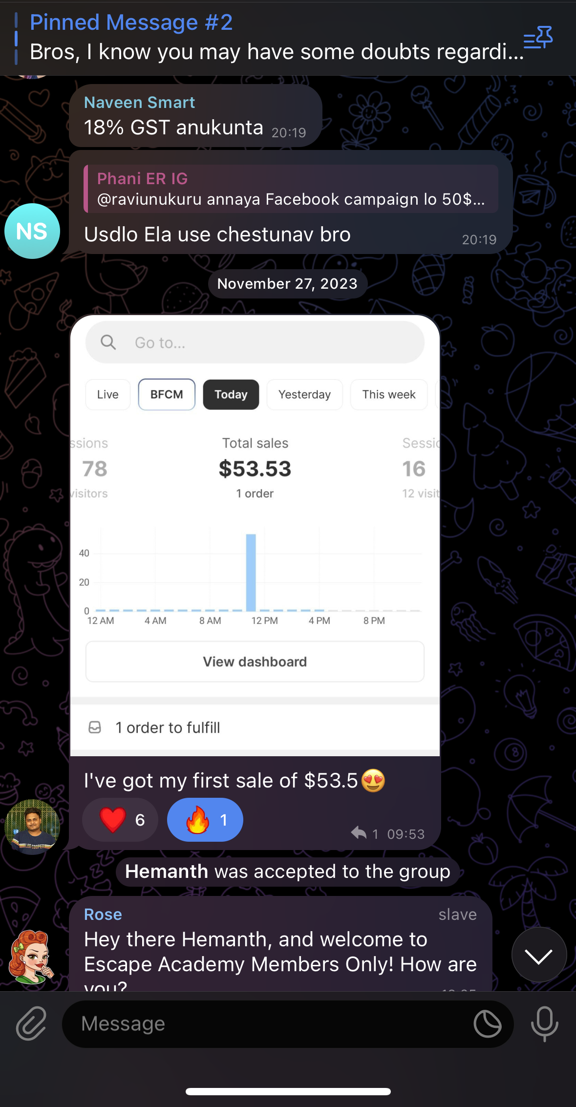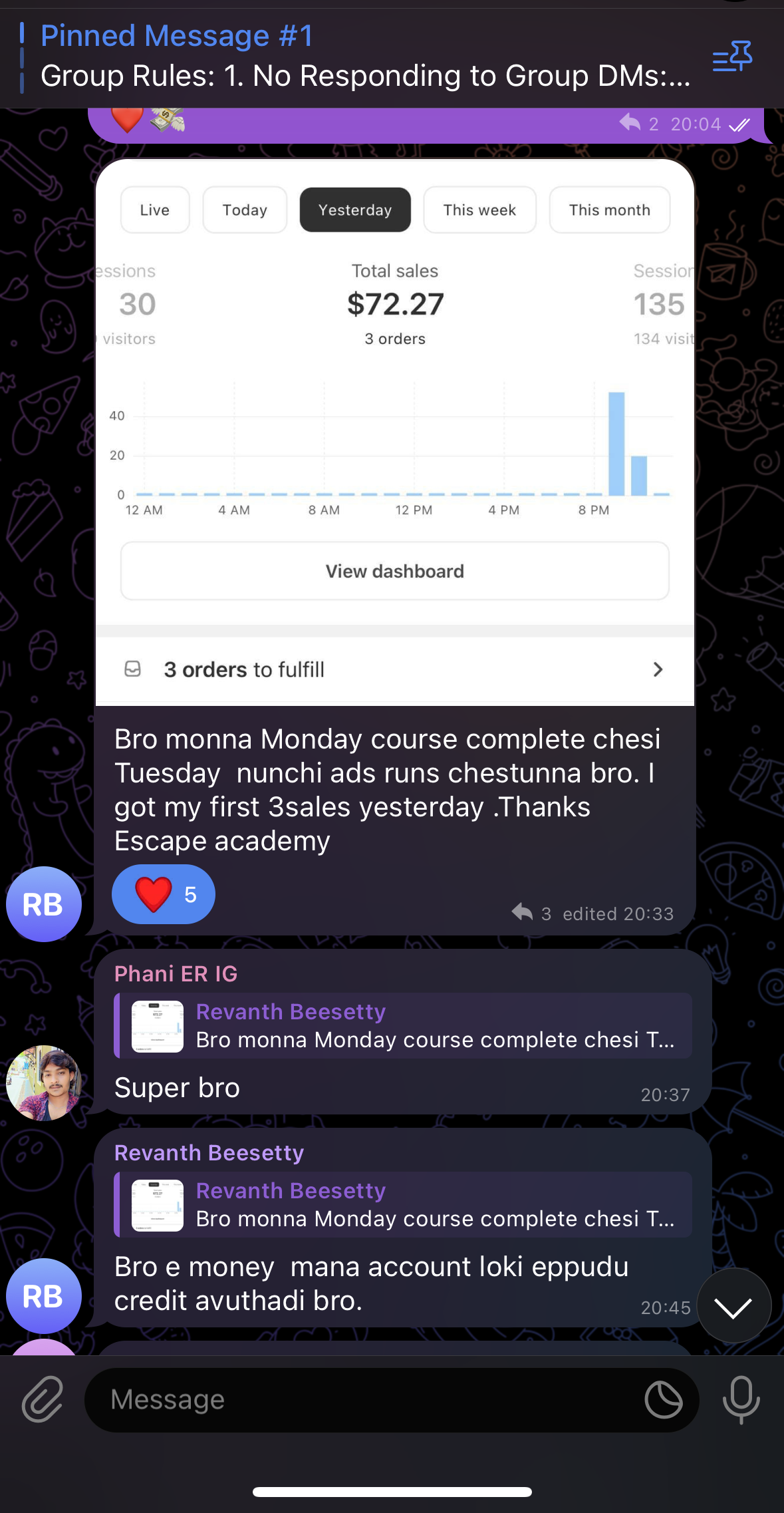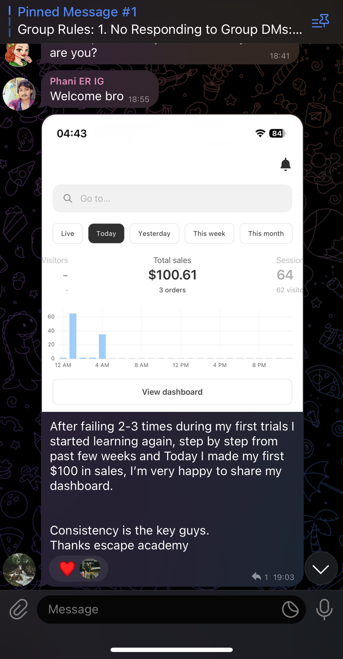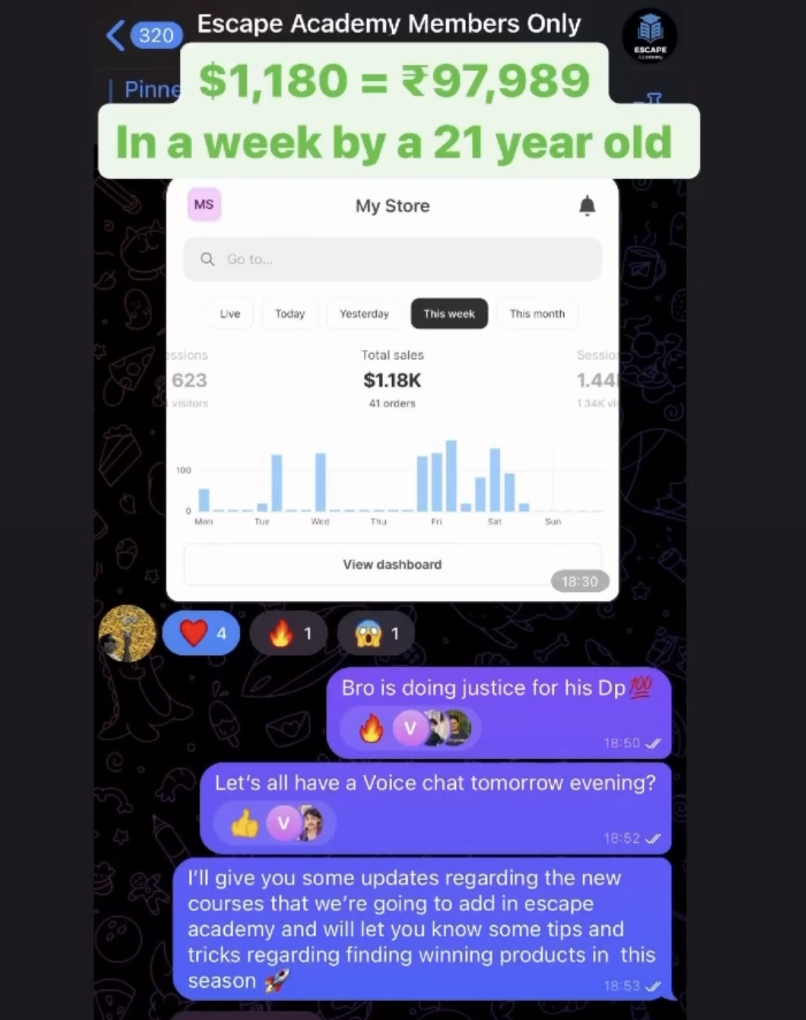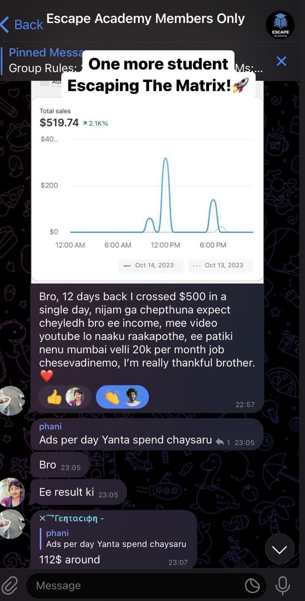 At "Escape Academy," we believe in the power of community support. When you join our course, you gain access to our Private Telegram group—an exclusive space where you can connect with like-minded students, share experiences, ask questions, and receive real-time support. Our instructors are actively involved in the group, providing insights, tips, and guidance. It's a vibrant community that fosters collaboration and learning, ensuring that you're never alone on your journey to e-commerce success. Join us in this dynamic environment and experience the strength of collective knowledge and encouragement. Together, we'll thrive and conquer the world of dropshipping and Facebook Ads!